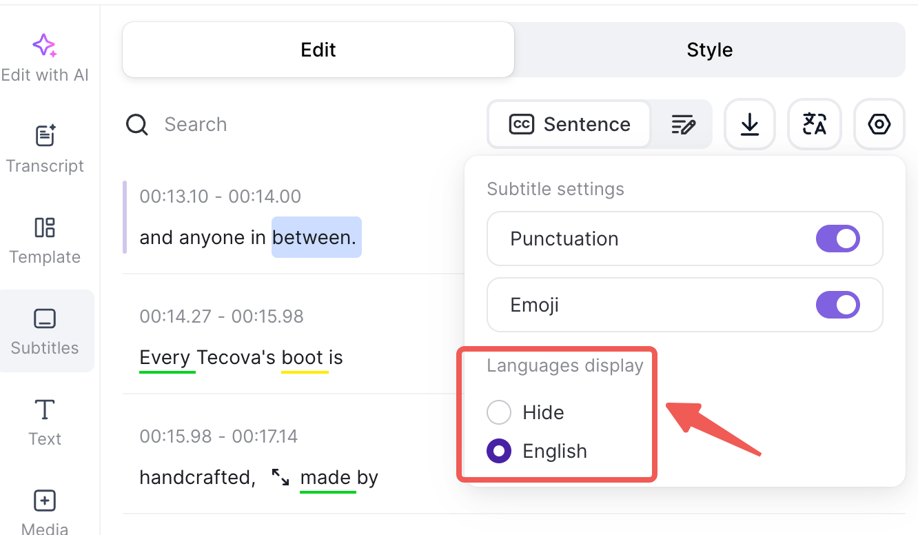 Use the subtitleSwitch parameter to control whether subtitles are displayed in the final clips.